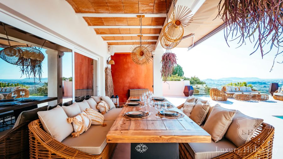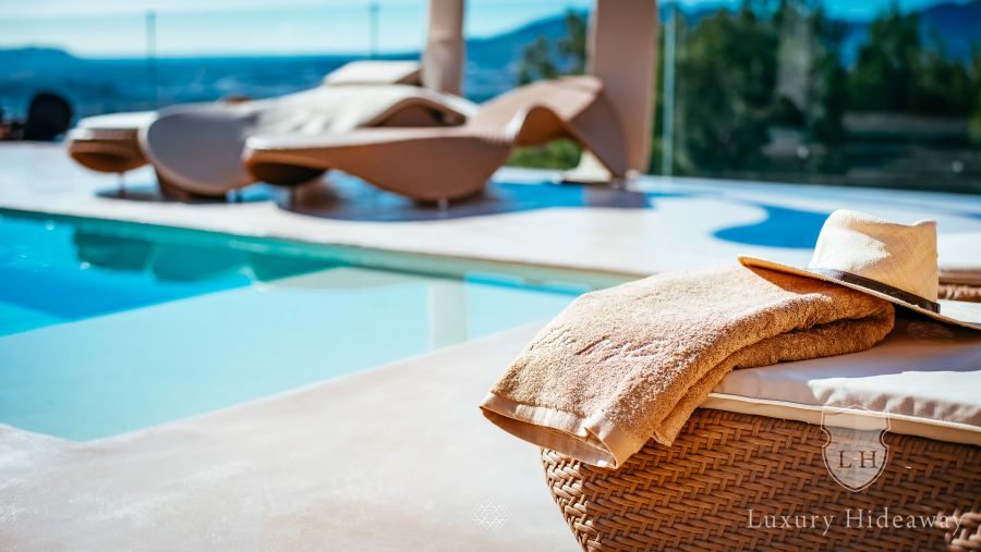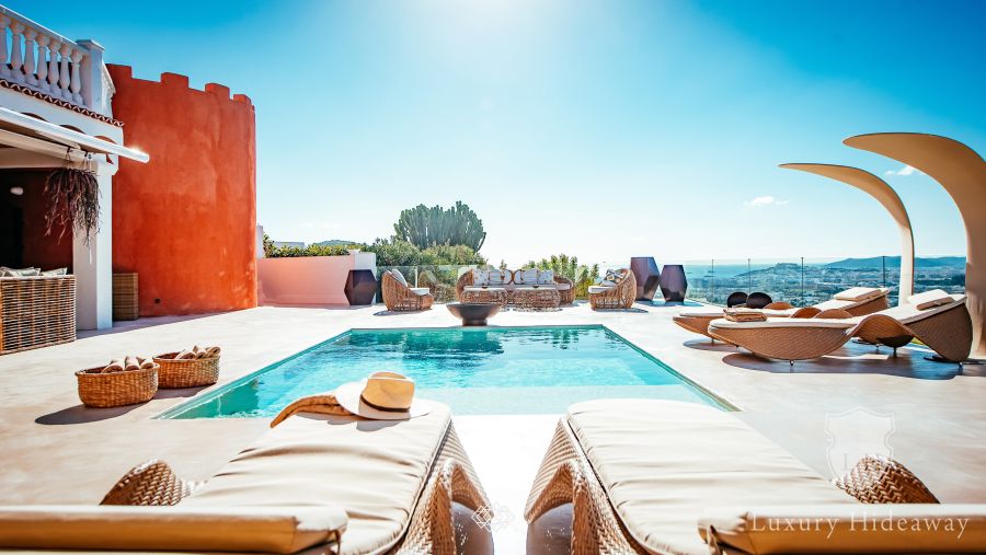 The pool deck, with its stylish sun loungers and Ibiza-inspired sofas, invites you to enjoy the breathtaking views while cooling off in the refreshing pool.