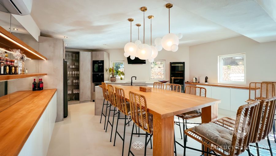 Villa Be Two is characterised by its unmistakable style: modern works of art, impressive paintings and artfully arranged sculptures and furniture can be found throughout the house. Upon entering the villa, you are greeted by a state-of-the-art, luxurious kitchen, which is harmoniously connected to a spacious dining area with a solid wooden table for up to 20 people.