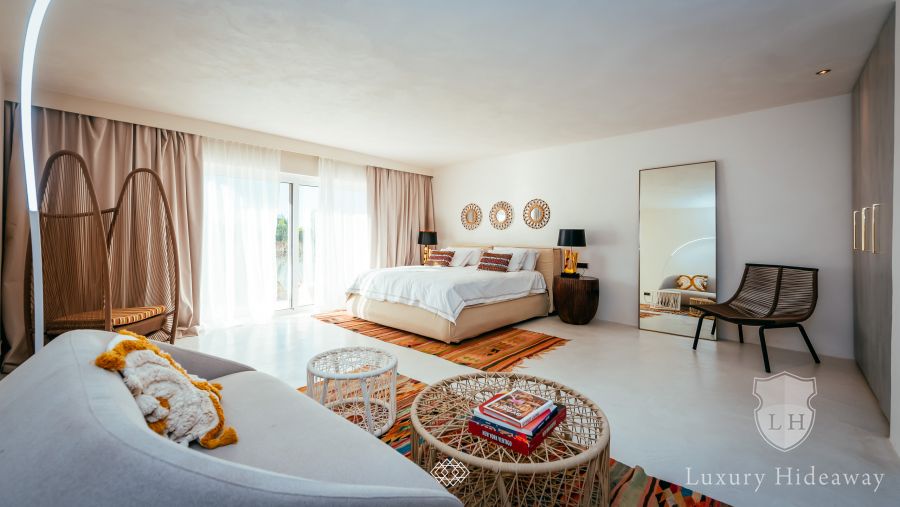Three of the six bedrooms are located on the ground floor. The master suite, which is located at the rear of the villa, offers a magnificent view of both the pool terrace and the picturesque Ibizan landscape. The 180° view from the luxurious bed is unforgettable. The elegant gold and white design continues in the spacious master bathroom, which is equipped with double washbasins and a magnificent shower.