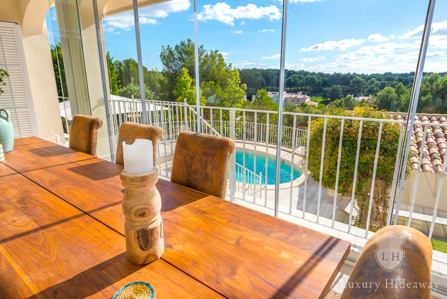 Die gepflegte Villa in exponierter Lage verfügt über eine hochwertige Ausstattung und ein sehr geschmackvolles Ambiente. Der Blick schweift über die Fairways des Golfclubs Bendinat bis zum Meer. Das Feriendomizil bietet Platz für 6 Personen.