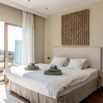 - Master bedroom with double bed and balcony, large whirlpool bathtub, two sinks, shower, and toilet