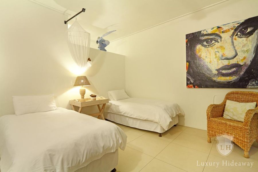 Im Erdgeschoss befinden sich zwei Schlafzimmer (jeweils mit eigenem Bad) und ein offener Wohnbereich mit einer weiteren voll ausgestatteten Küche. Auch hier führt jedes Zimmer auf die vordere Terrasse, den üppigen Garten und den privaten Swimmingpool.