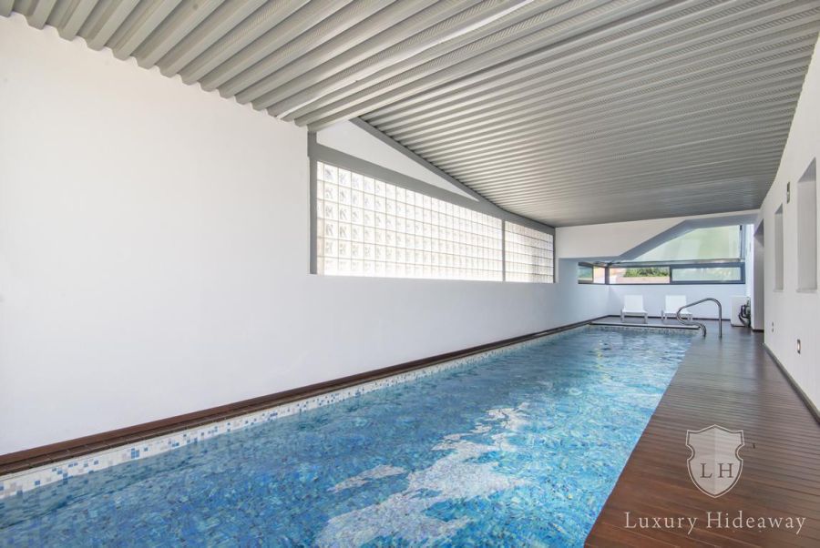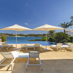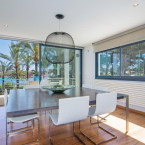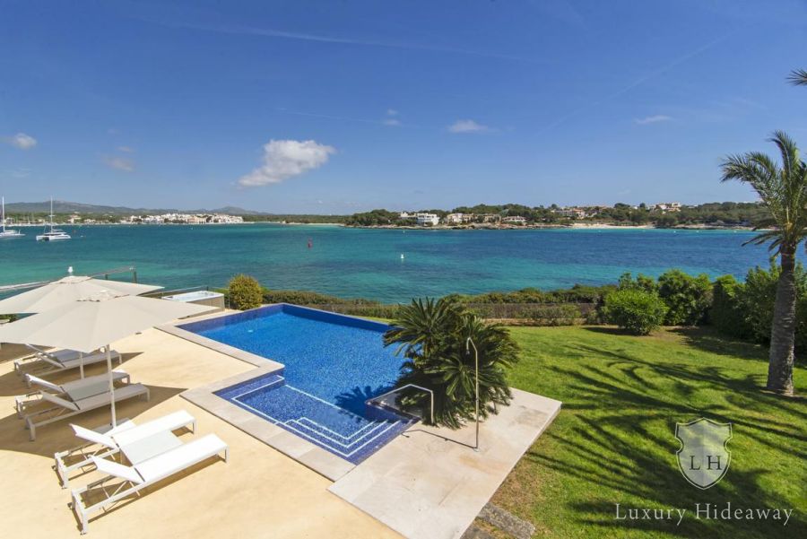 The villa with stunning views over the bay and the nature harbor of Porto Colom, is situated in a quiet residential area. The spacious villa has been built on a large plot of land and offers sea access. The bright and ample living room is situated at the same level as the entrance door. Here are also the kitchen, a small bedroom and the main bedroom with shower and a double bath en suite. The floor downstairs you can reach over the staircase from the hall. For clients with a handicap it would be possible to use the elevator (on petition). There are 2 bedrooms at the ground floor, both of them with bathroom en suite and access to the terrace and the garden. Further is here the TV room, the laundry, a small kitchen and another highlight…. a 12,5 x 2,5 m inside pool. Here are also a few sports equipment’s, a shower and a whirlpool. At this level is as well the garden situated with his outside pool, from where you have an amazing view on the boats and yachts that are entering and leaving the bay.